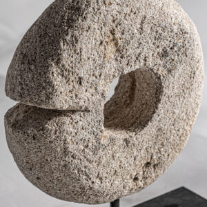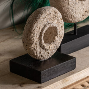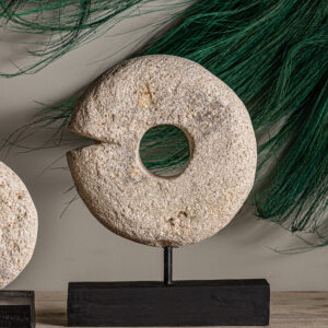 FIGURA DECORATIVA, EN COLOR BLANCO/NEGRO, DE ESTILO CONTEMPORÁNEO. FABRICADO EN PIEDRA, COMBINADO CON MADERA TROPICAL.