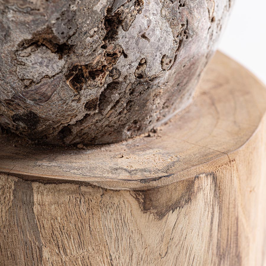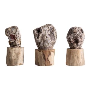 Figura decorativa surtido 0 de estilo nórdico fabricado en cristal en color tonos en marrón combinado con madera de teka en color marrón claro.