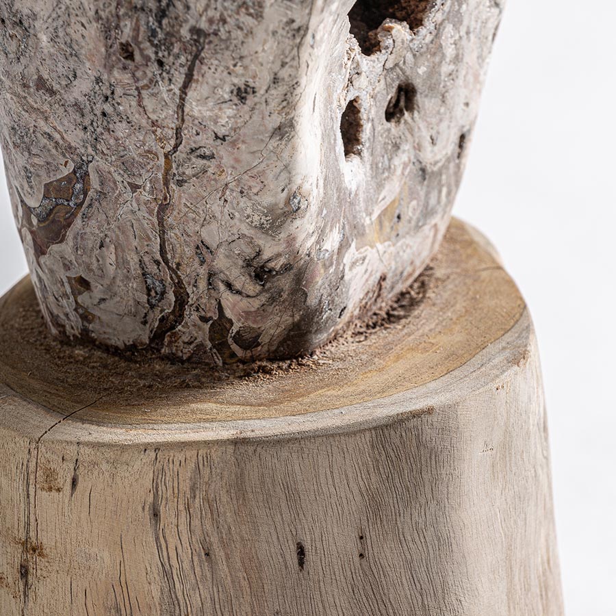 Figura decorativa surtido 0 de estilo nórdico fabricado en piedra en color tonos oscuros combinado con madera de teka en color marrón claro.