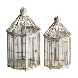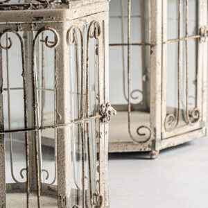 Jaula j 2 en color blanco roto envejecido de estilo provenzal. Fabricado en hierro combinado con cristal.