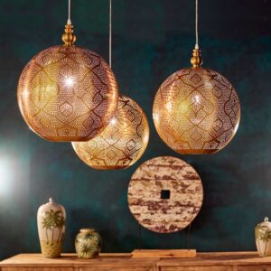 Lámpara colgante de acero en color dorado envejecido. Su singular pantalla en forma de esfera presenta un calado en toda la superficie siguiendo un diseño.