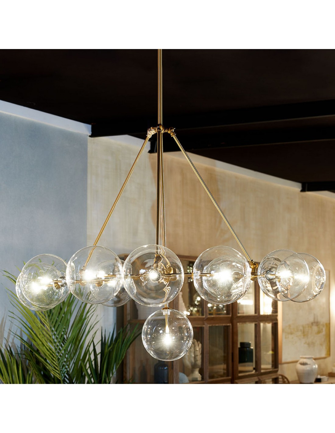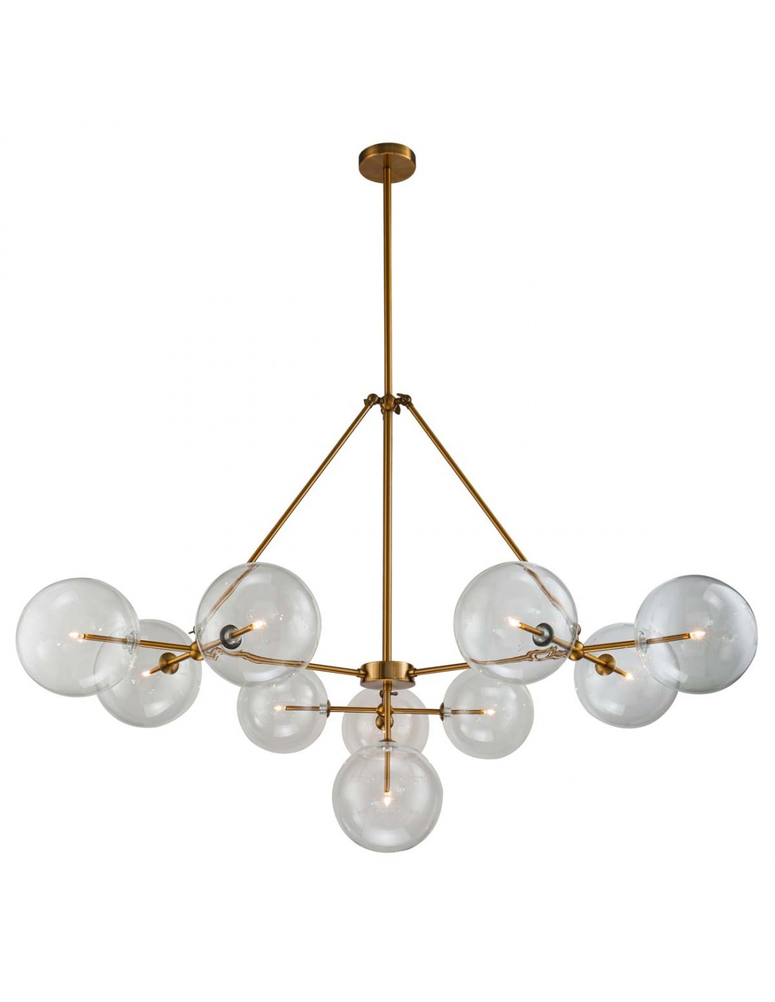 Lámpara colgante con estructura de tubo metálico dorado envejecido y pantallas de bola de cristal.