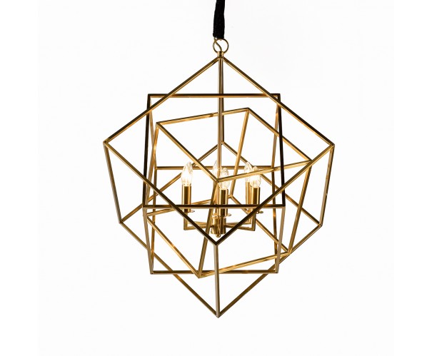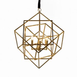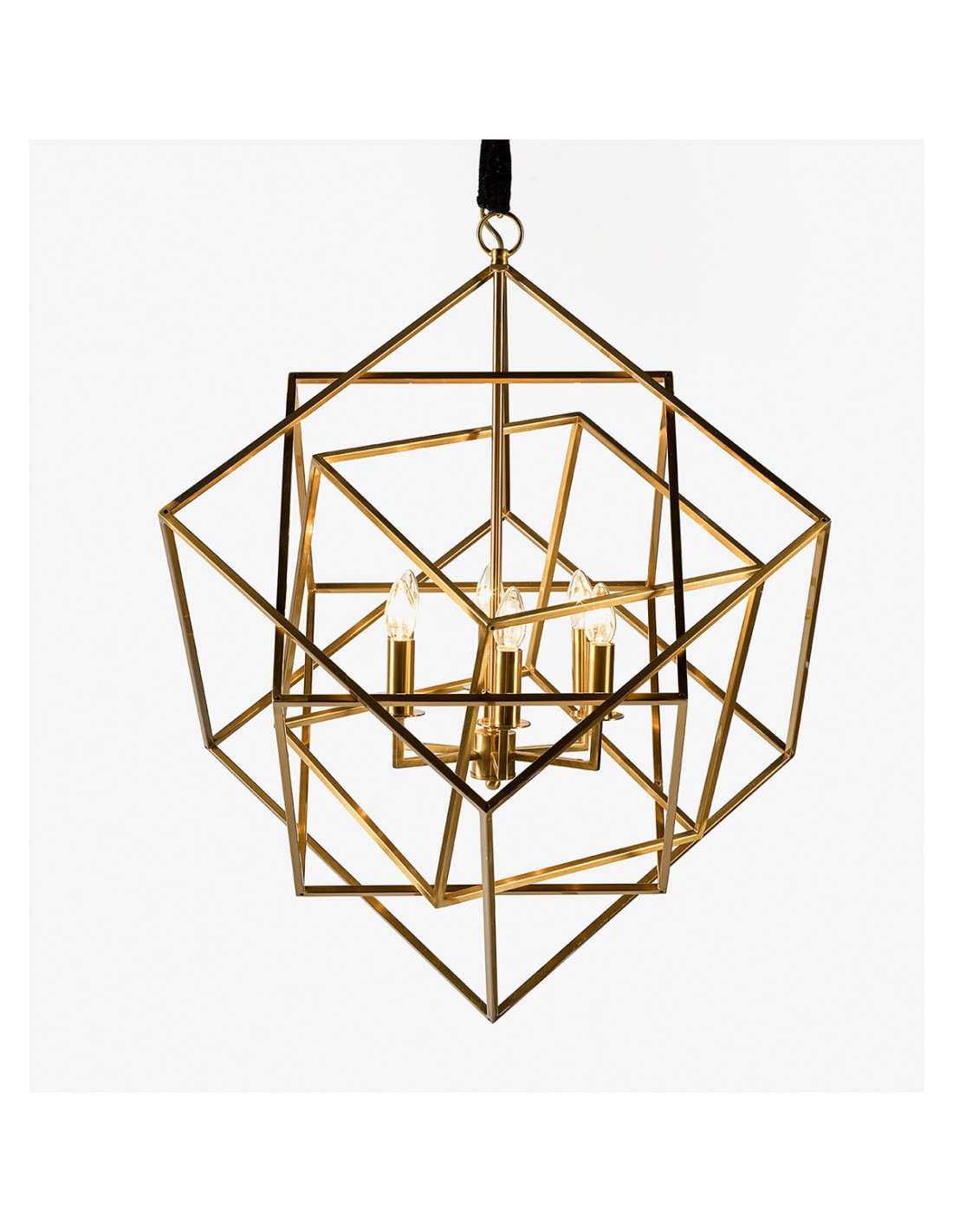 Exclusiva lámpara de diseño vintage fabricada en metal dorado con estructura de cubos geométricos y cinco brazos tipo candelabro. Bombillas no incluidas