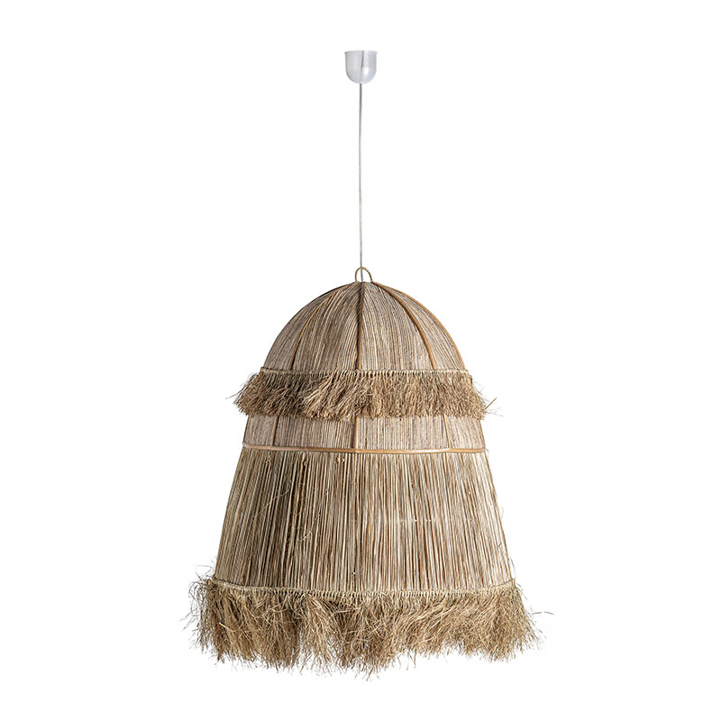 Lámpara de colgar de estilo boho fabricado en madera de coco en color marrón combinado con fibra natural.