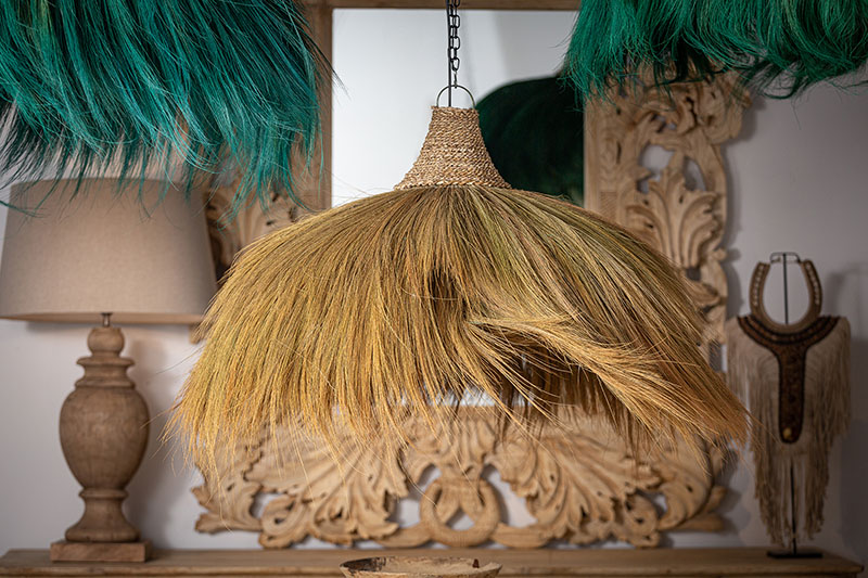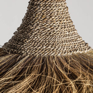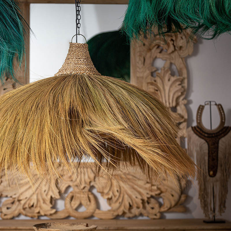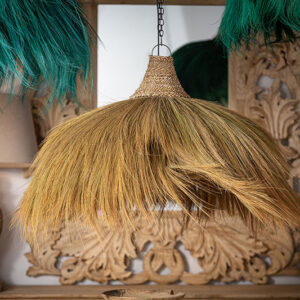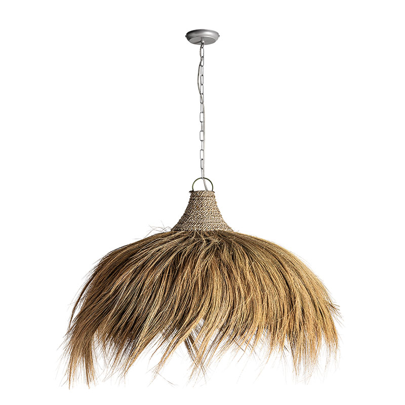 Lámpara de colgar sinko de estilo étnico fabricado en fibra natural en color marrón combinado con hierro.