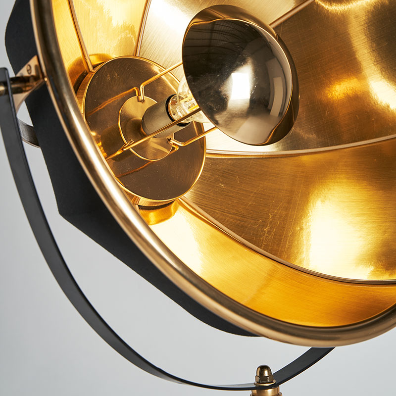 Lámpara de pie, en color oro, de estilo art deco. Fabricado en hierro. Producto elevable, plegable, extensible.
