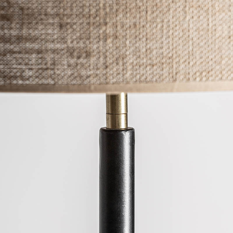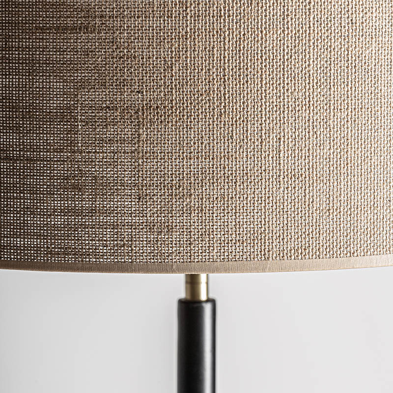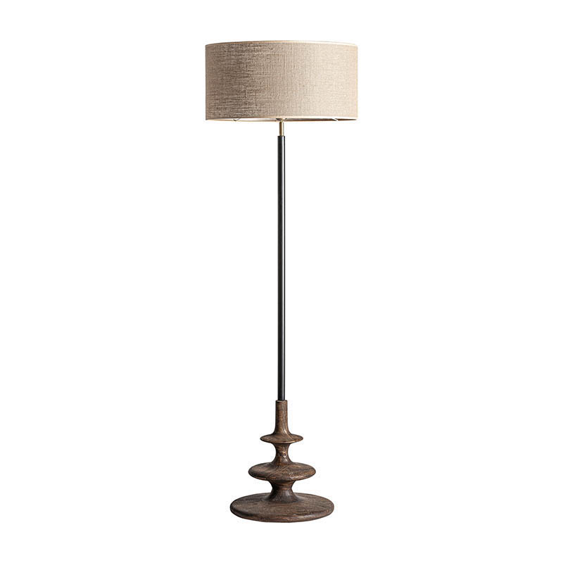 Lámpara de pie, en color marrón, de estilo colonial. Fabricado en madera de mango, combinado con hierro y yute.
