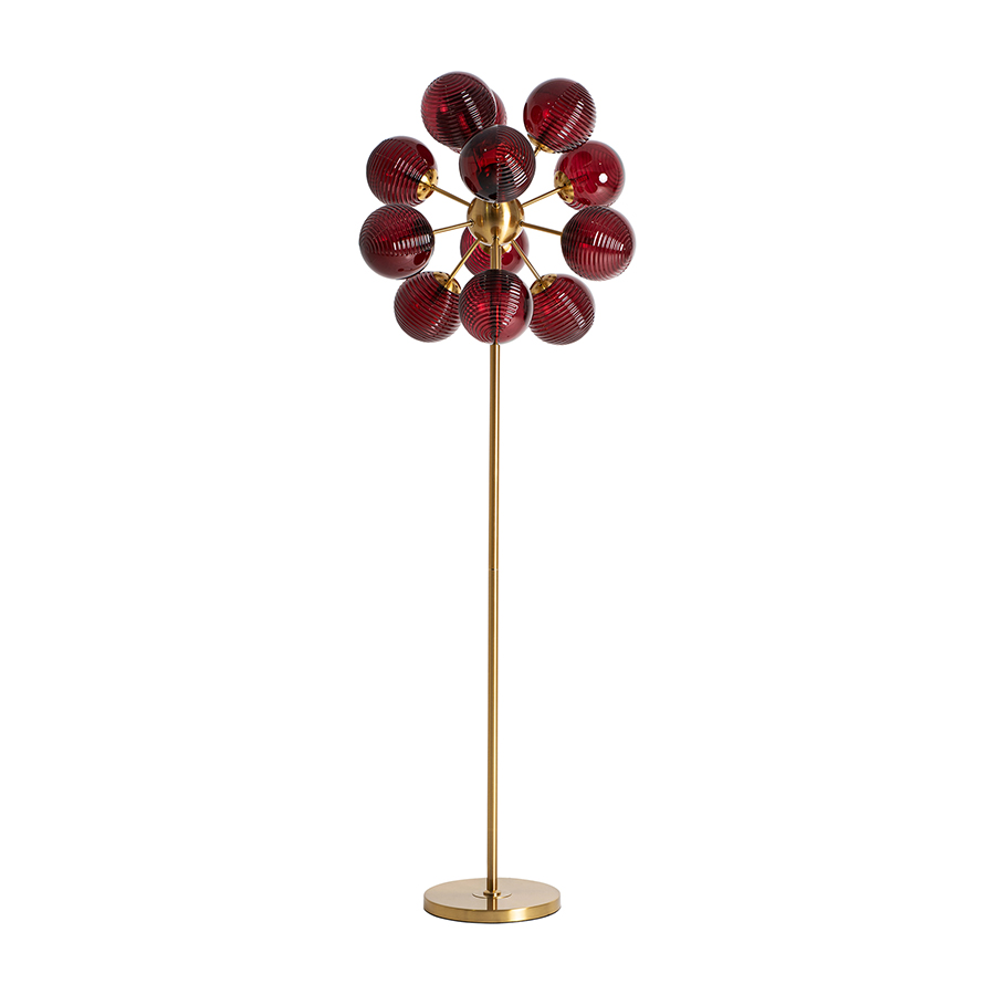 Lámpara de pie Alaia de estilo art deco fabricado en cristal en color burdeos combinado con hierro en color oro. Producto desmontable.