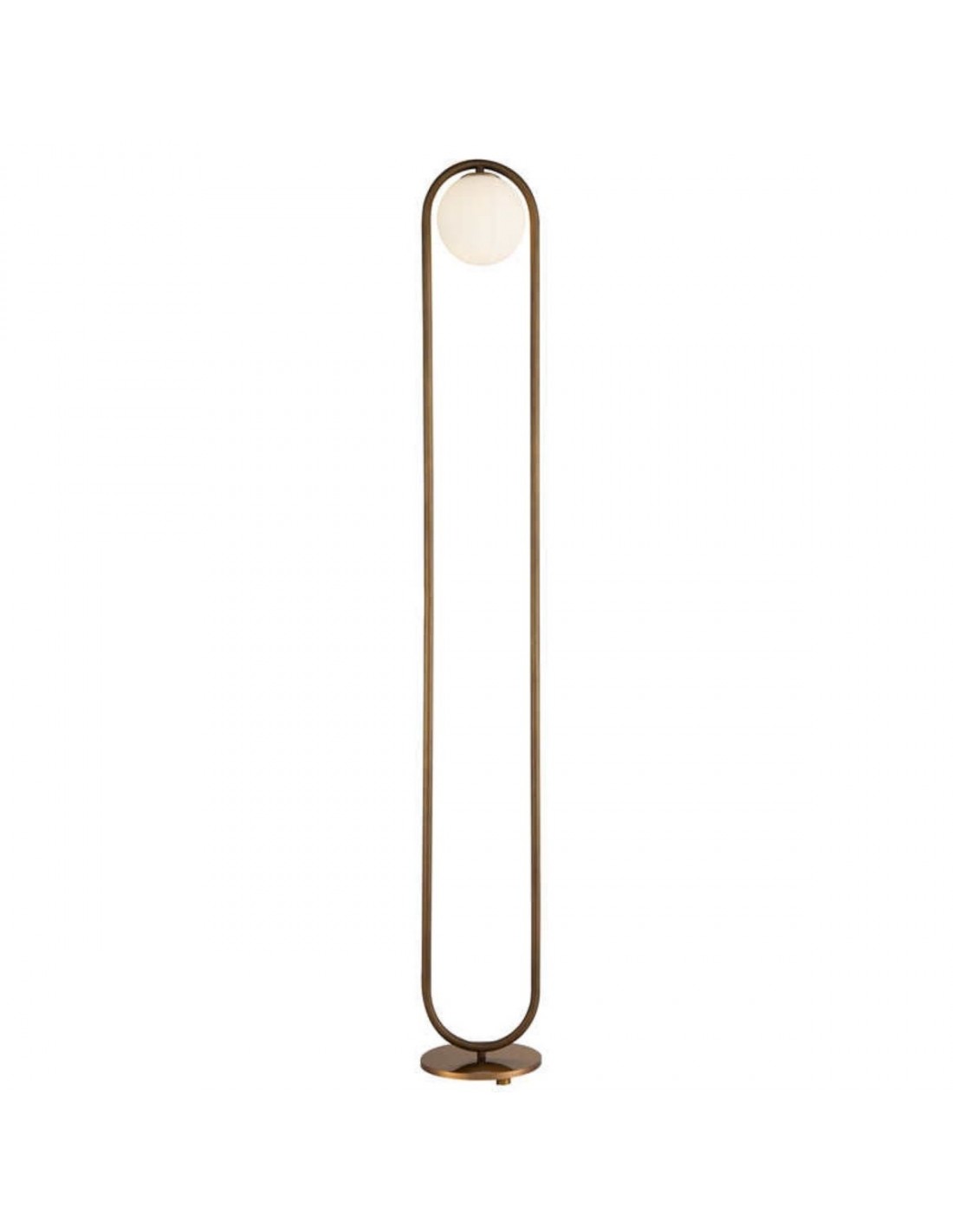 Lámpara de pie con estructura metálica y globo de cristal opaco blanco.