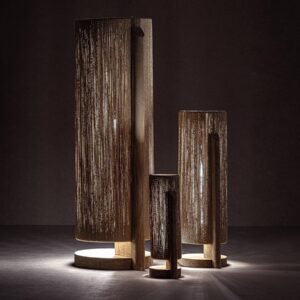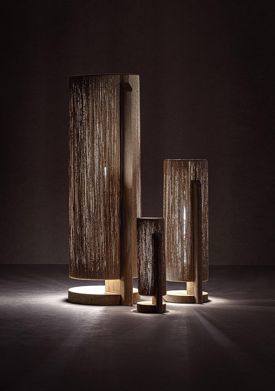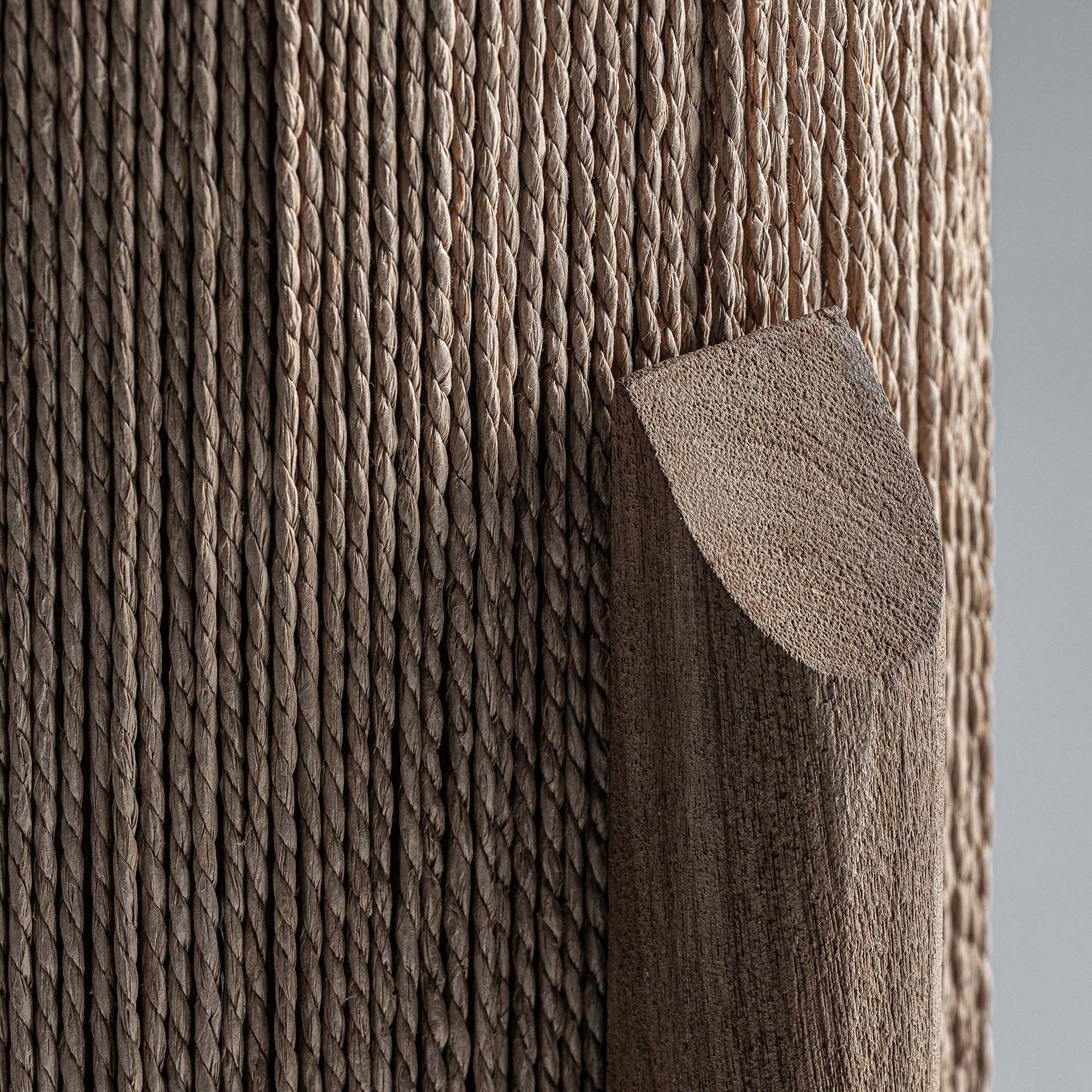 Lámpara de pie jacquard de estilo contemporáneo. Fabricado en madera de mango en color marrón combinado con rafia en color marrón claro.