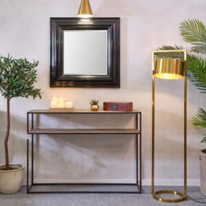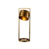 Lámpara de pie en metal con acabado dorado envejecido. Cuenta con una base con líneas rectas y una pantalla giratoria de metal también en color dorado envejecido.