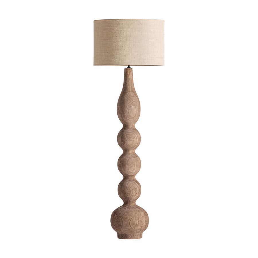Lámpara de pie cogne de estilo contemporáneo fabricado en madera de mango en color marrón combinado con yute en color crema.