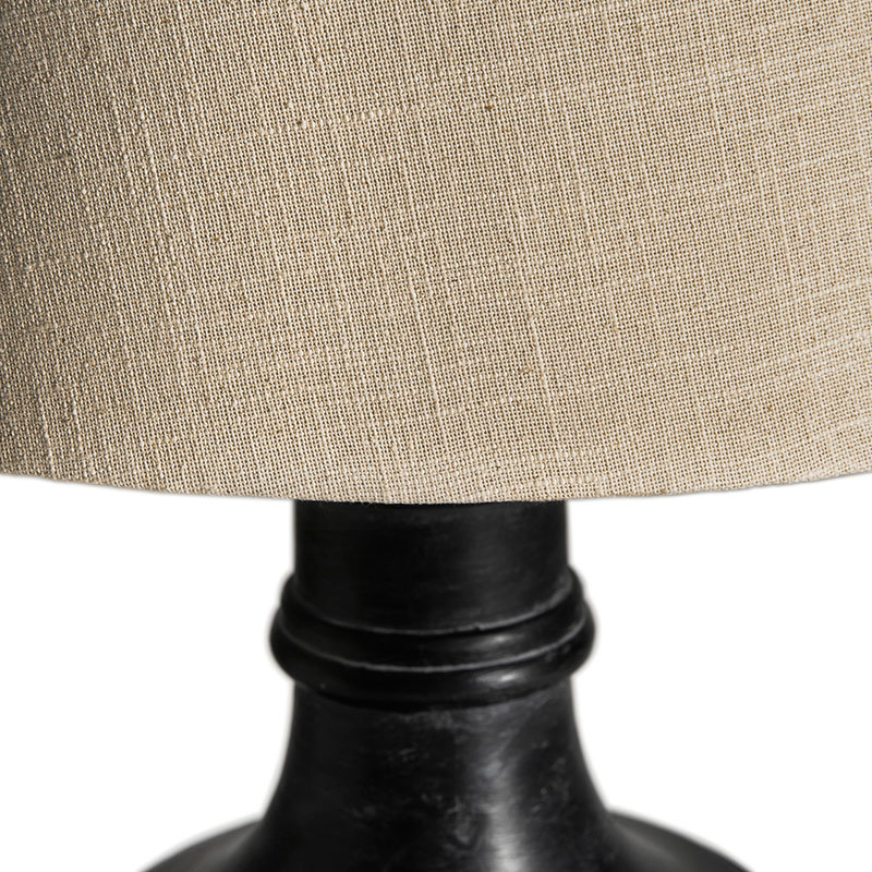 Lámpara de sobremesa de estilo provenzal fabricado en madera de mango en color negro con acabado decapado combinado con algodón.