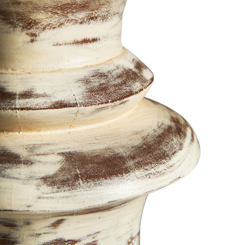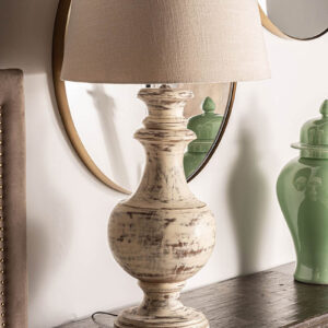 Lámpara de sobremesa de estilo provenzal fabricado en madera de mango en color blanco con acabado decapado combinado con algodón.