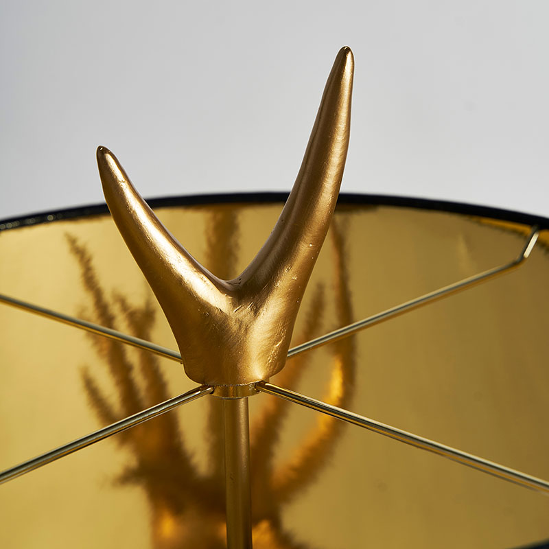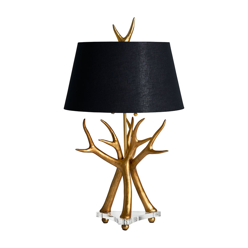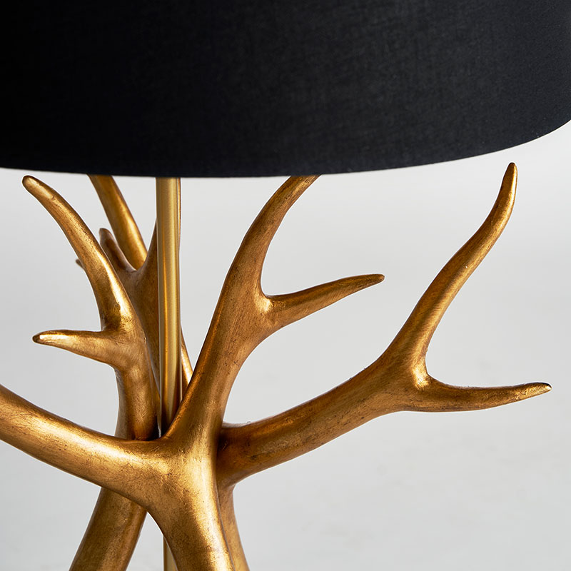 Lámpara de sobremesa, de estilo art deco. Fabricado en resina, en color negro, combinado con cristal, en color oro y algodón. Producto desmontable.