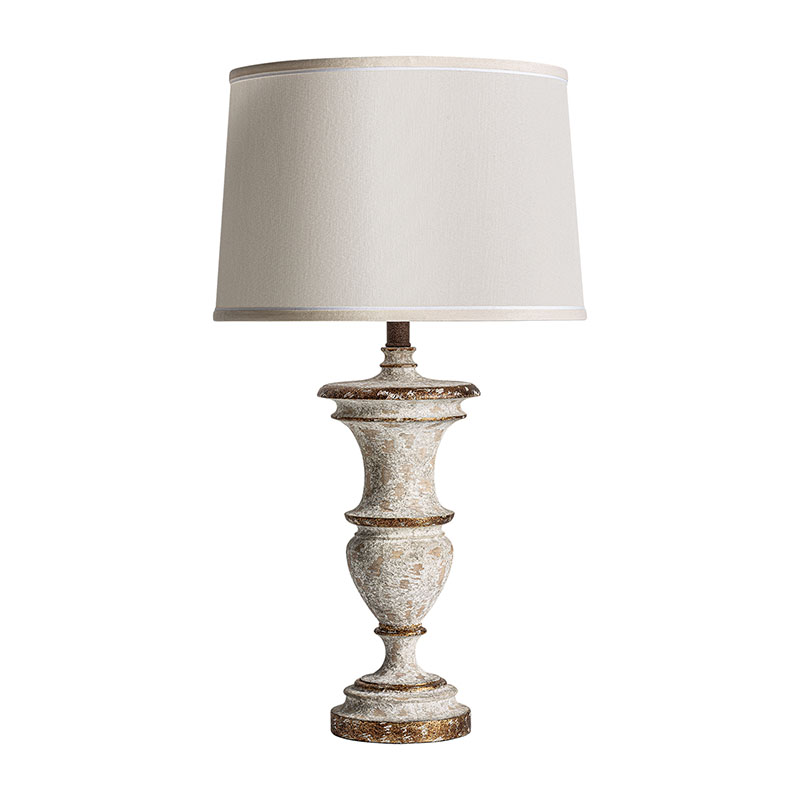 Lámpara de sobremesa de estilo provenzal fabricado en madera eucalipto en color blanco roto combinado con hierro y lino. Producto desmontable.