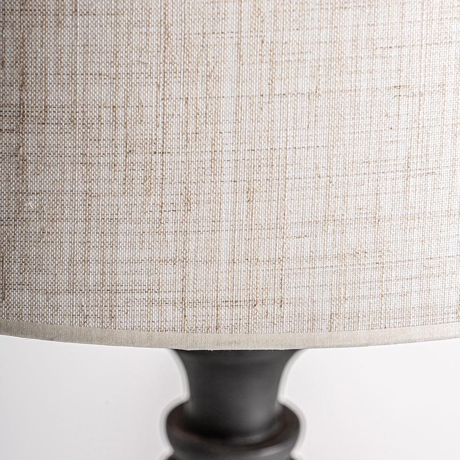 Lámpara de sobremesa de estilo colonial fabricado en terracota en color marrón con acabado envejecido combinado con lino en color blanco.