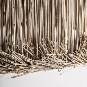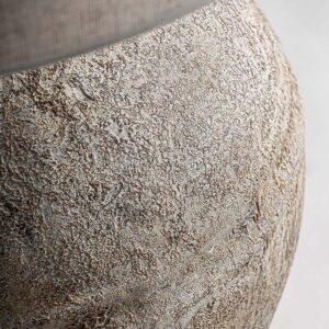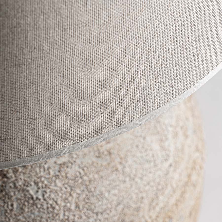 Lámpara de sobremesa de estilo provenzal fabricado en cerámica en color tonos claros con acabado envejecido combinado con algodón en color gris con acabado jaspeado.