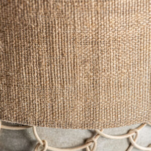 Lámpara de sobremesa de estilo contemporáneo fabricado en cemento en color blanco con acabado decapado combinado con yute en color marrón.