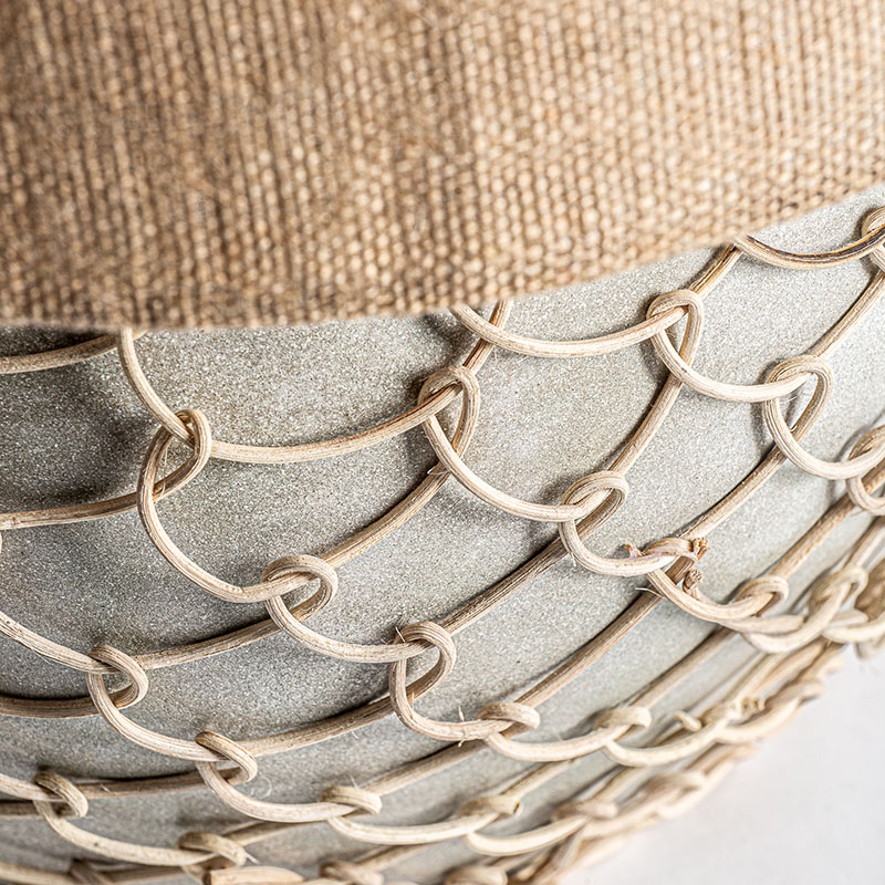 Lámpara de sobremesa de estilo contemporáneo fabricado en cemento en color gris combinado con ratán en color crema y yute. Producto desmontable elevable.