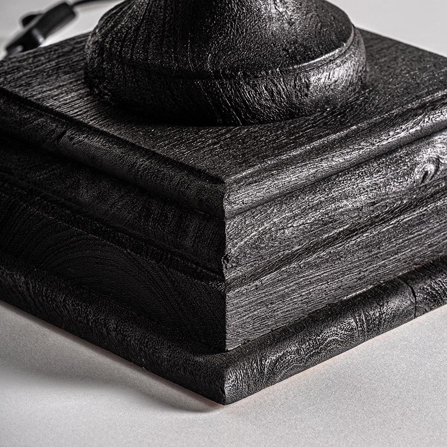 • Lámpara de sobremesa de estilo colonial fabricado en madera de mango en color negra combinado con algodón en color blanco y hierro en color oro con acabado viejo. Producto desmontable.