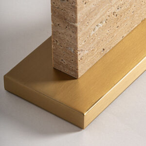 Lámpara de sobremesa de estilo art deco fabricado en travertino en color marrón combinado con hierro en color oro y algodón bouclé en color blanco roto. Producto desmontable.