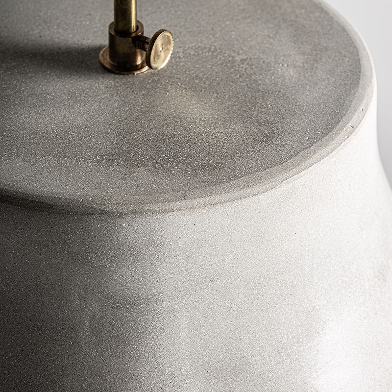 Lámpara de sobremesa de estilo contemporáneo fabricado en cemento en color blanco con acabado decapado combinado con yute en color marrón.
