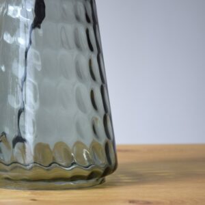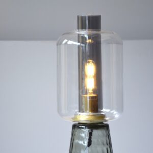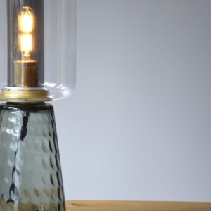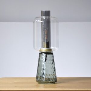 LÁMPARA DE MESA COLECCIÓN CANDIL REALIZADA EN VIDRIO. SU FORMA RECUERDA A LOS ANTIGUOS CANDILES DE LUZ CÁLIDA Y SINUOSA PERO SE HA REINTERPRETADO USANDO EL VIDRIO CON TEXTURA Y COLOR PARA LA BASE Y UN DOS CUERPOS DE VIDRIO TRANPARENTE PARA LA PARTE SUPERIOR. EL USO DE UNA BOMBILLA DE FILAMENTOS PERMITE EVOCAR LA IMAGEN DE UN CANDIL. SE TRATA DE UNA LÁMPARA DE DISEÑO SUTIL PERO QUE DESTACA POR EL MATERIAL Y SU COLOR.
