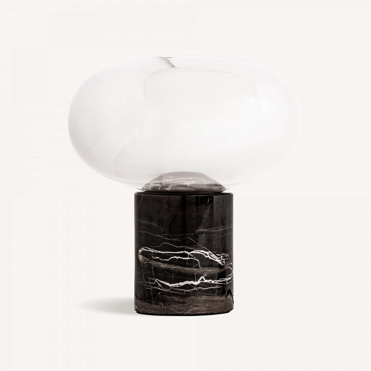 Lámpara de sobremesa eira, en color gris, de estilo art deco. Fabricado en cristal, combinado con mármol. Cristal ahumado.