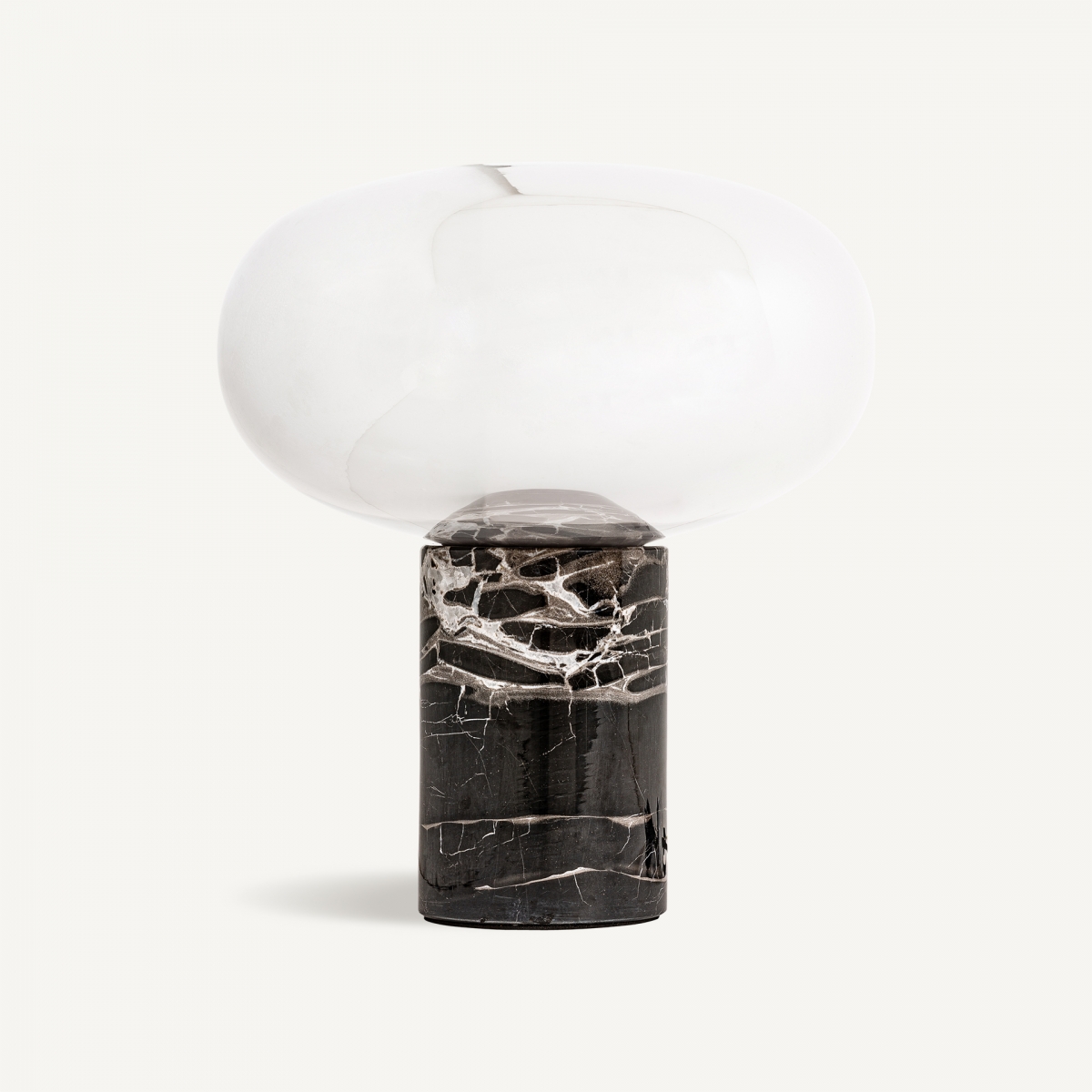 Lámpara de sobremesa eira, en color gris, de estilo art deco. Fabricado en cristal, combinado con mármol. Cristal ahumado.