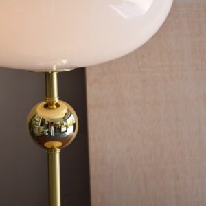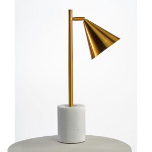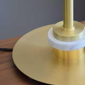 LÁMPARA DE MESA REALIZADA EN VIDRIO COLOR BLANCO METAL CON ACABADO DORADO Y DETALLE EN MÁRMOL EN LA BASE.