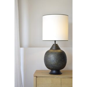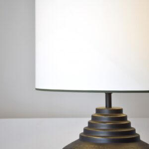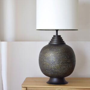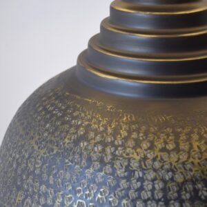 LÁMPARA DE MESA REALIZADA EN ALUMINIO Y ACABADO EN COLOR NEGRO Y DETALLES EN ORO VIEJO. EL ALUMINIO ES TRABAJADO A MANO DE FORMA ARTESANAL PARA CONSEGUIR UNA SUPERFIE CON TEXTURA ÚNICA EN CADA PIEZA.
