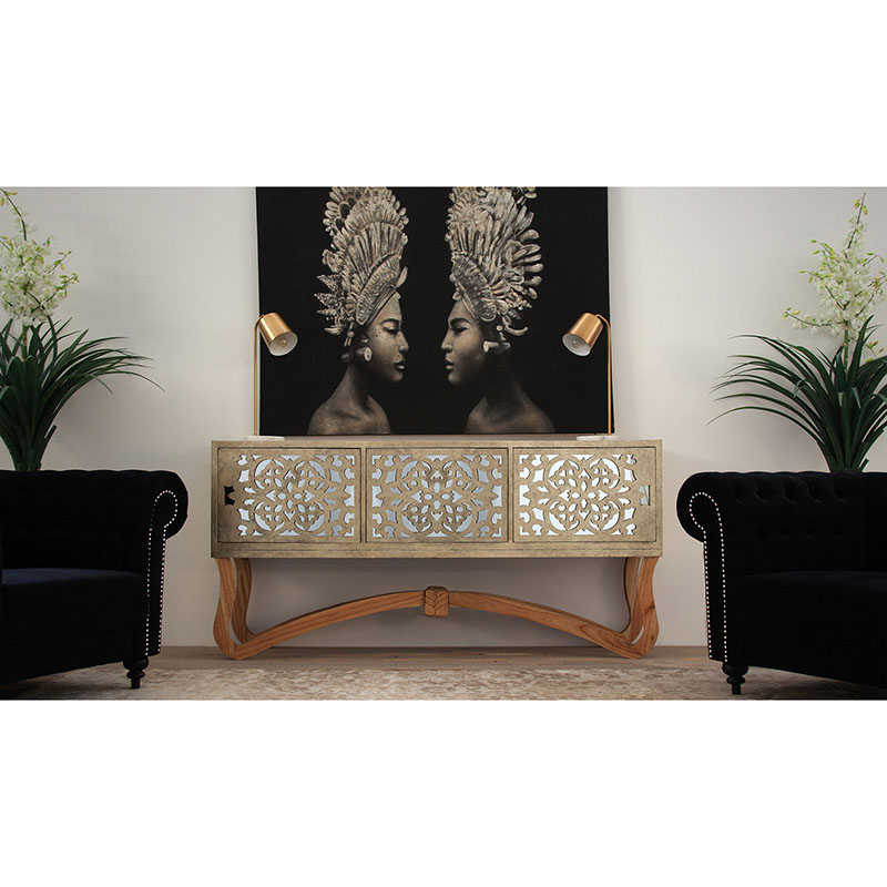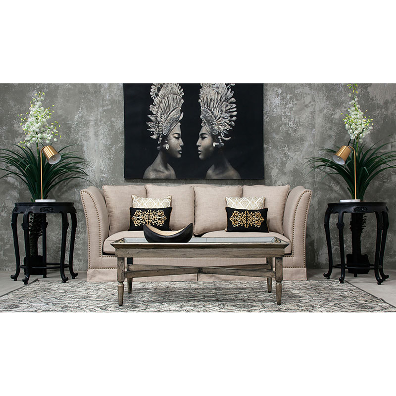 Lienzo rectangular caras balinesas, en color negro artesanal, de estilo oriental. Fabricado en loneta, combinado con madera de pino.
