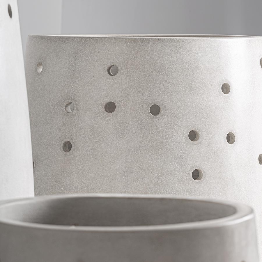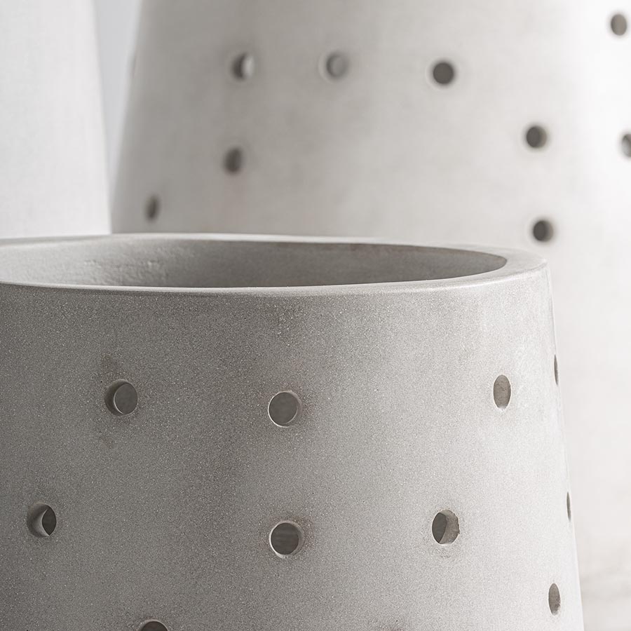 Macetero j 3 Jacquard de estilo contemporáneo fabricado en cemento en color blanco roto. Producto apilable.