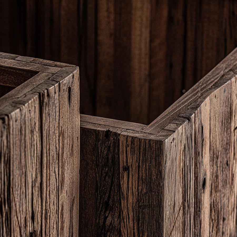 Macetero j 2 Samsun de estilo colonial fabricado en madera recuperada en color marrón. Producto apilable.