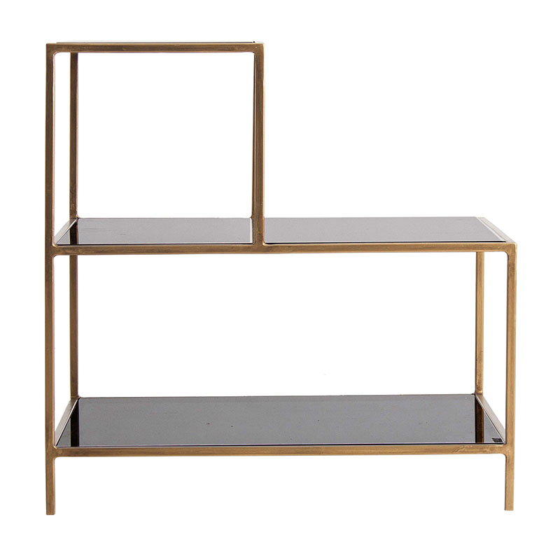 Mesa auxiliar batorz, en color negro/oro, de estilo art deco. Fabricado en hierro, combinado con cristal. Producto desmontable.