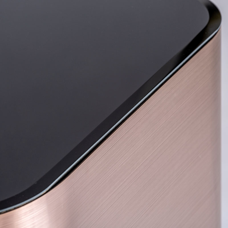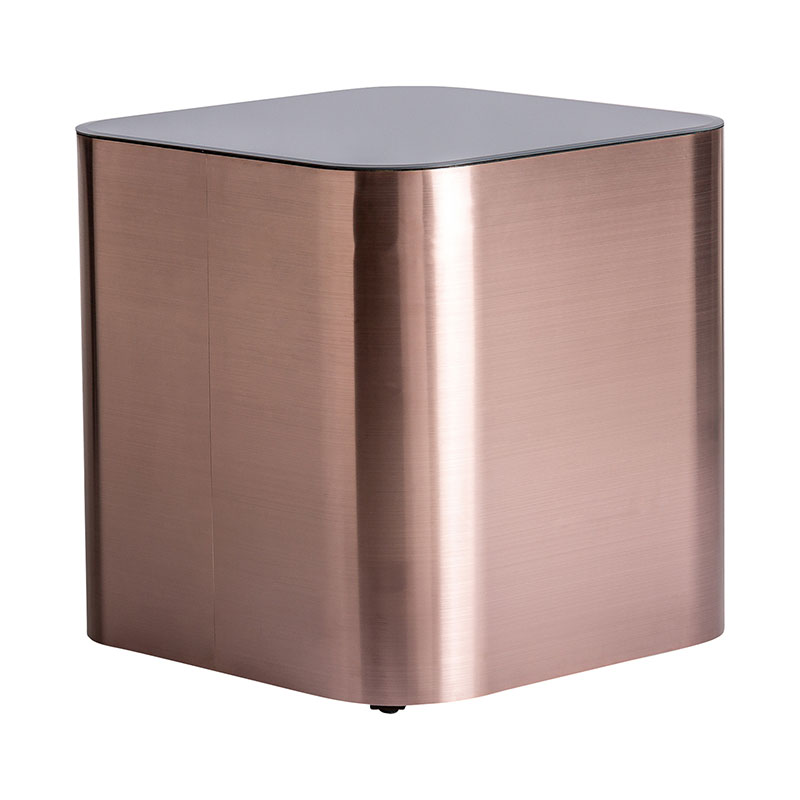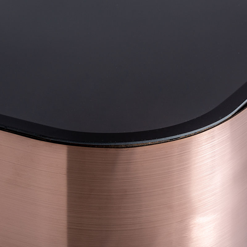 Mesa auxiliar redonda gmunden de estilo art deco fabricado en acero en color cobre combinado con mármol sintético.