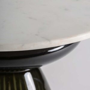 Mesa auxiliar Hallstatt de estilo art deco fabricado en vidrio en color verde combinado con mármol en color blanco y acero en color oro.