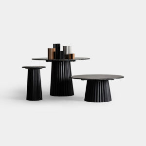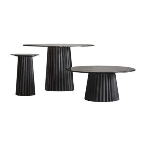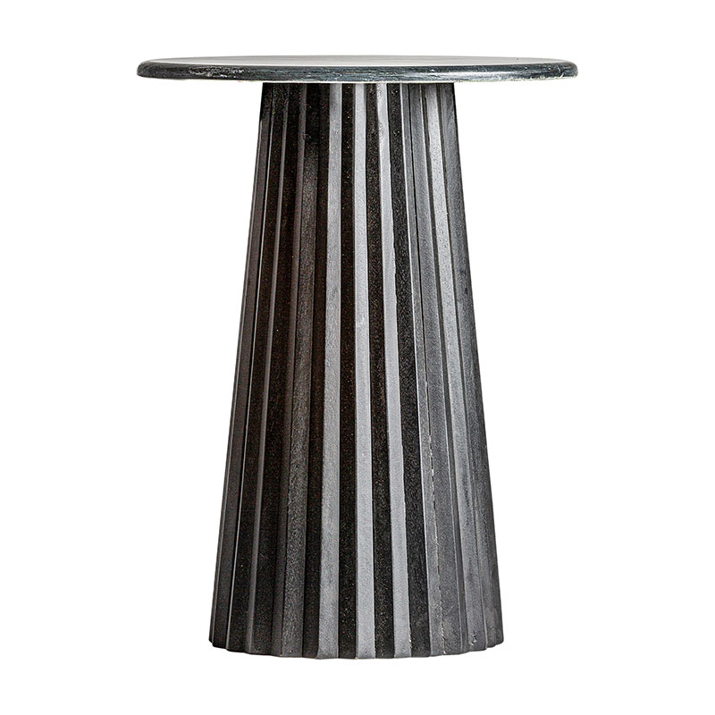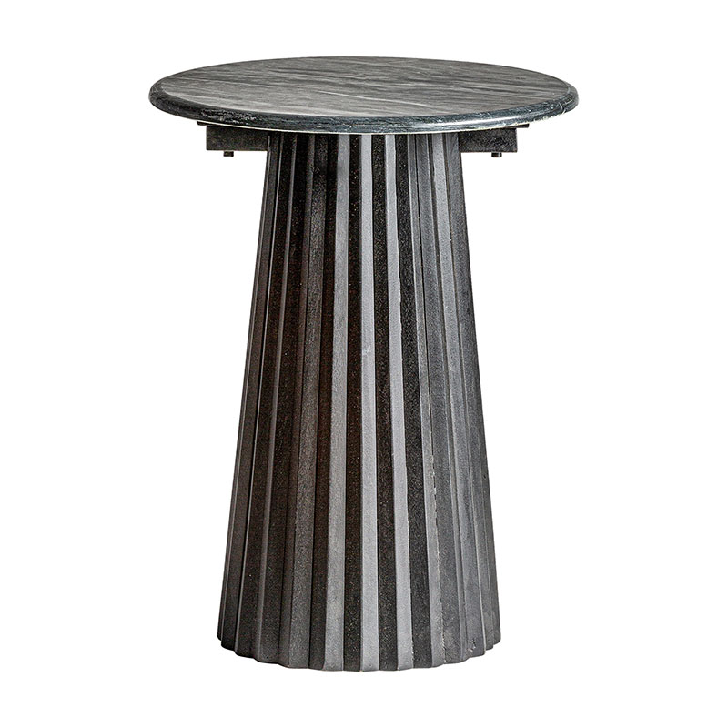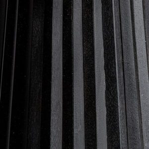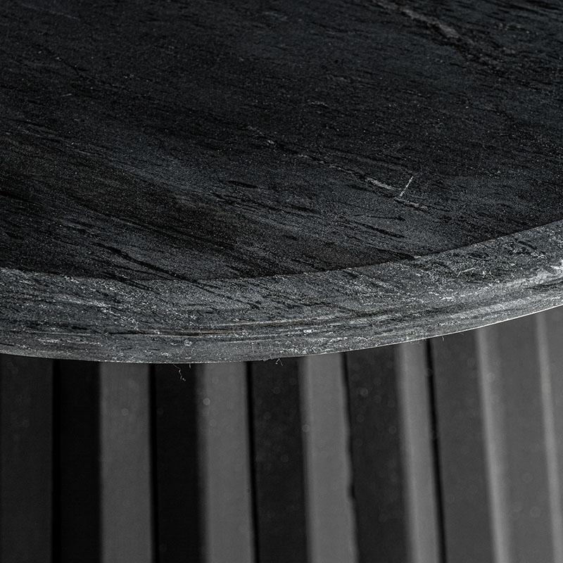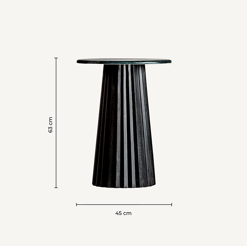 Mesa auxiliar plissé wood, en color negro, de estilo art deco. Fabricado en madera de mango, combinado con mármol mate. Limpiar rápidamente la superfície del mármol si se mancha para evitar marcas. Producto desmontable.