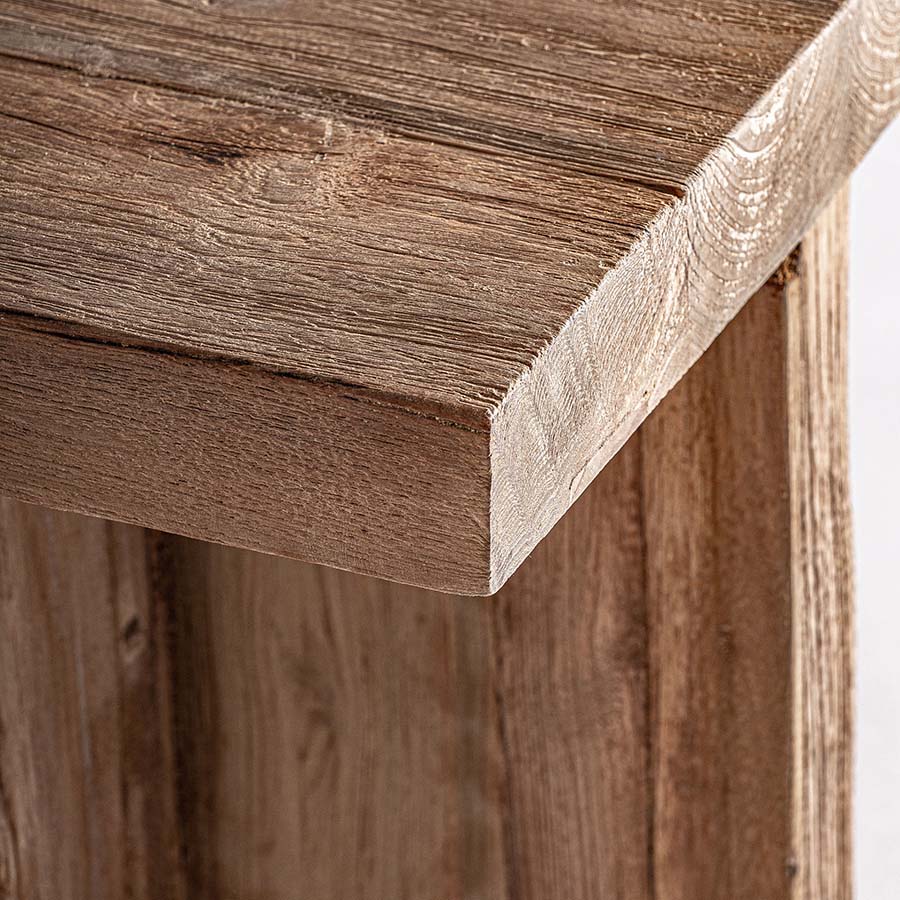 Mesa auxiliar breive de estilo rústico fabricado en madera de pino reciclado en color marrón con acabado envejecido.