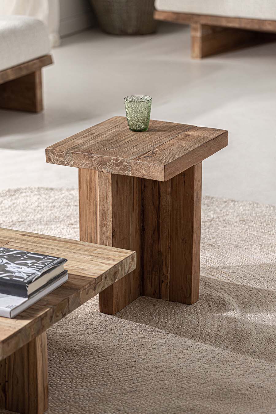Mesa auxiliar pure de estilo colonial fabricado en madera de teka reciclada en color marrón con acabado natural.