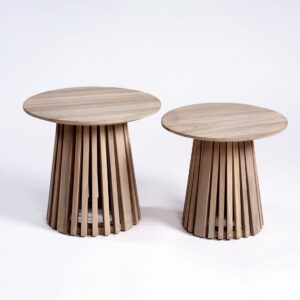 Mesa auxiliar de exterior en madera de teca envejecida. Cuenta con pie central de palillería en la misma madera. Puede combiar con otras medidas del modelo NOA para crear un set. Se venden por separado.