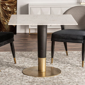 Mesa bar naustdal de estilo art deco fabricado en acero en color blanco combinado con porcelánico en color oro. Producto desmontable.