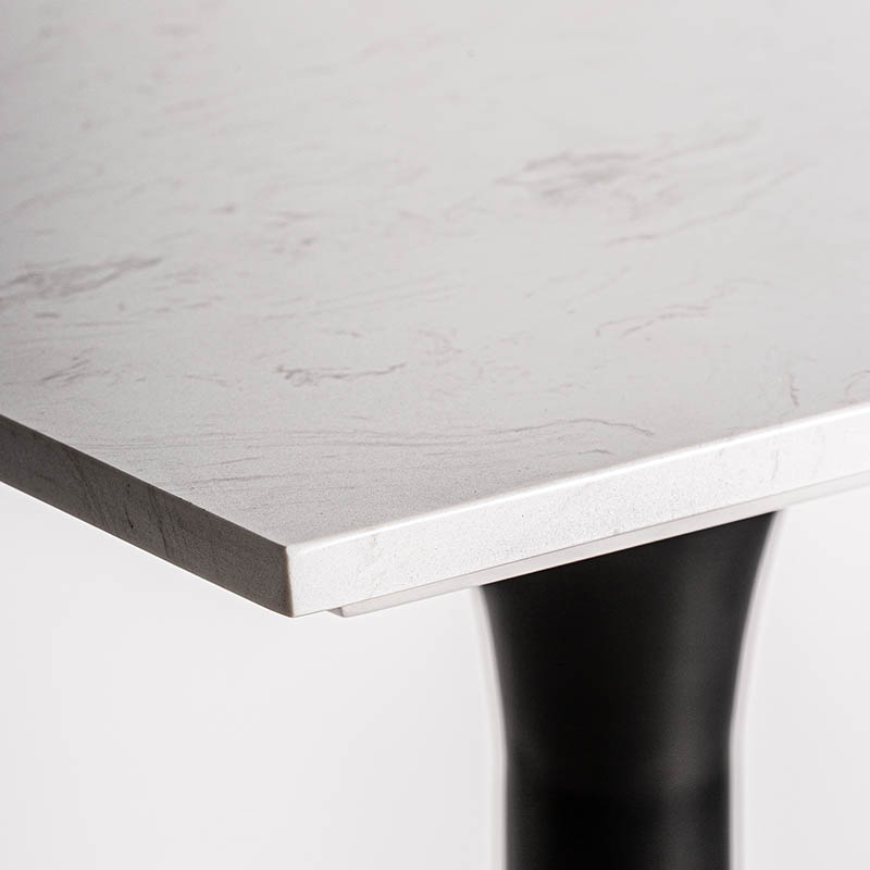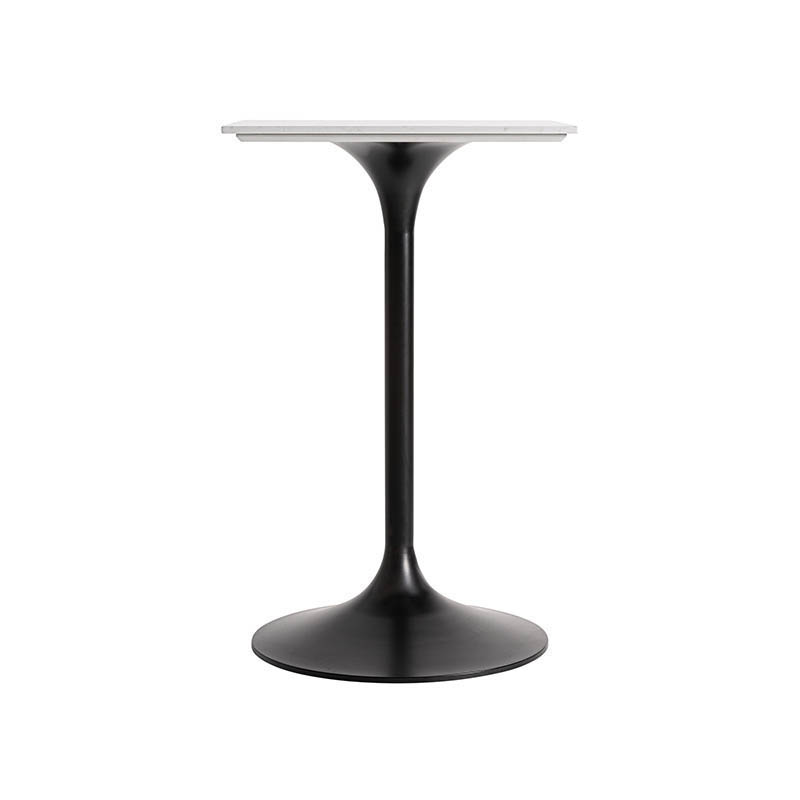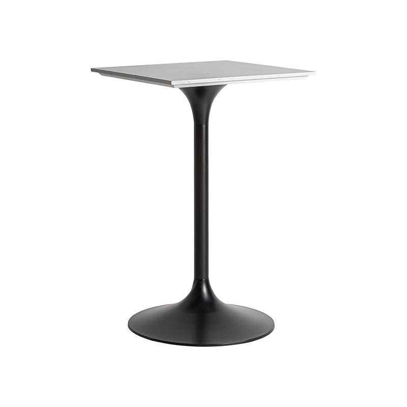 Mesa bar perrier de estilo art deco fabricado en porcelánico en color blanco combinado con acero en color negro. Producto desmontable.