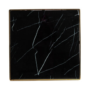 Mesa auxiliar than de estilo art deco fabricado en mármol sintético en color negro con acabado brillo combinado con acero en color oro y hierro. Producto desmontable.