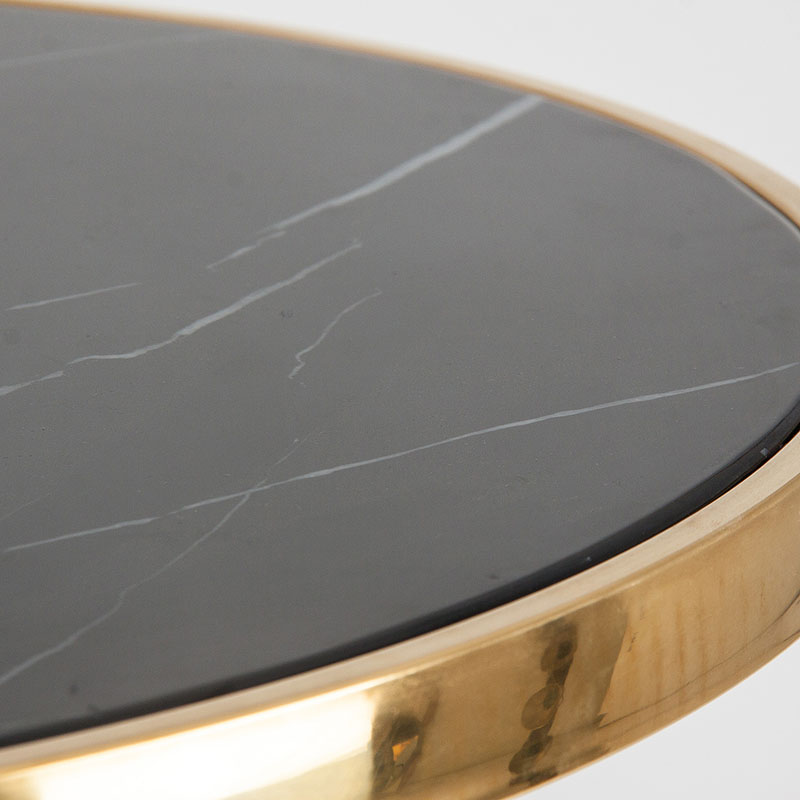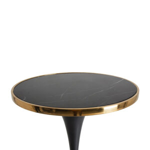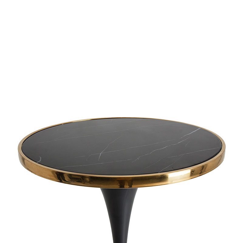 Mesa bar Than de estilo art deco fabricado en hierro en color negro con acabado brillo combinado con mármol sintético en color oro y acero. Producto desmontable.
