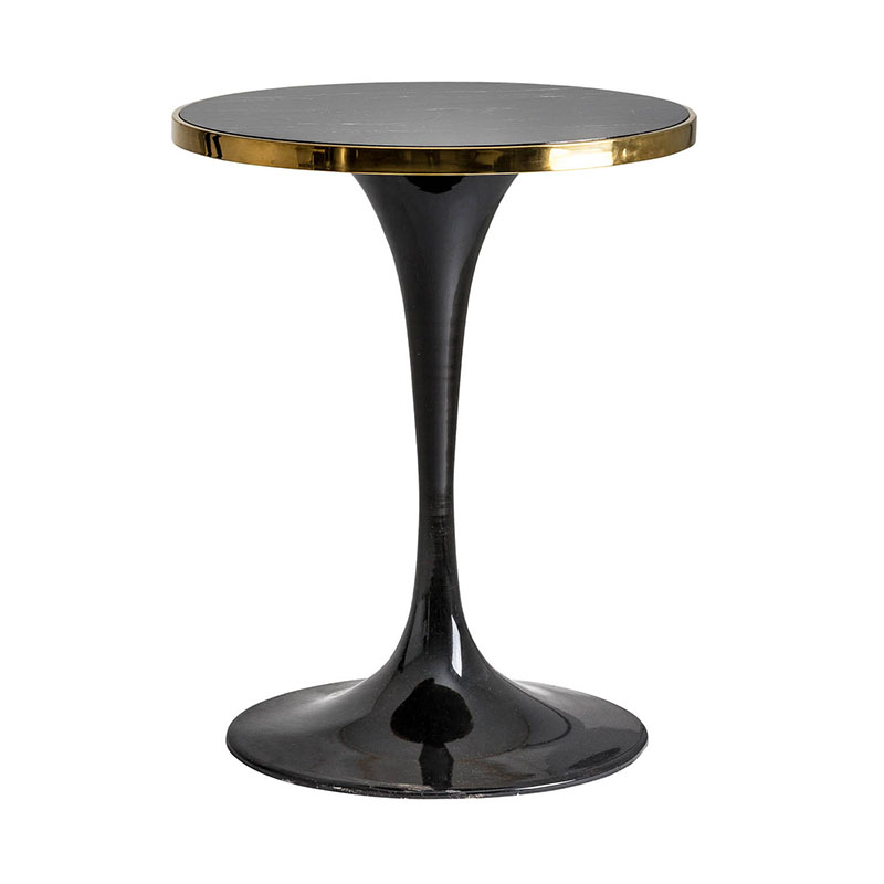 Mesa auxiliar than de estilo art deco fabricado en mármol sintético en color negro con acabado brillo combinado con acero en color oro y hierro. Producto desmontable.