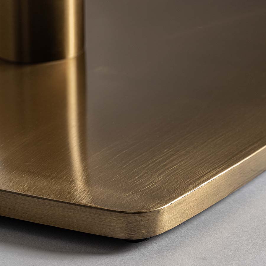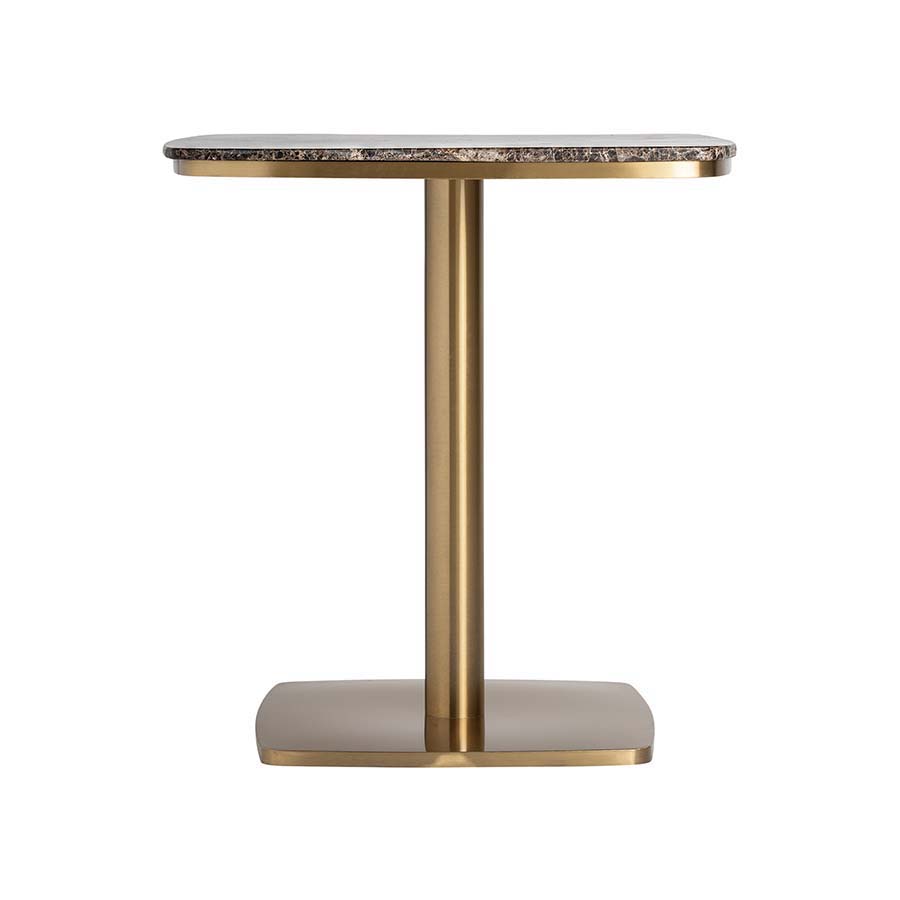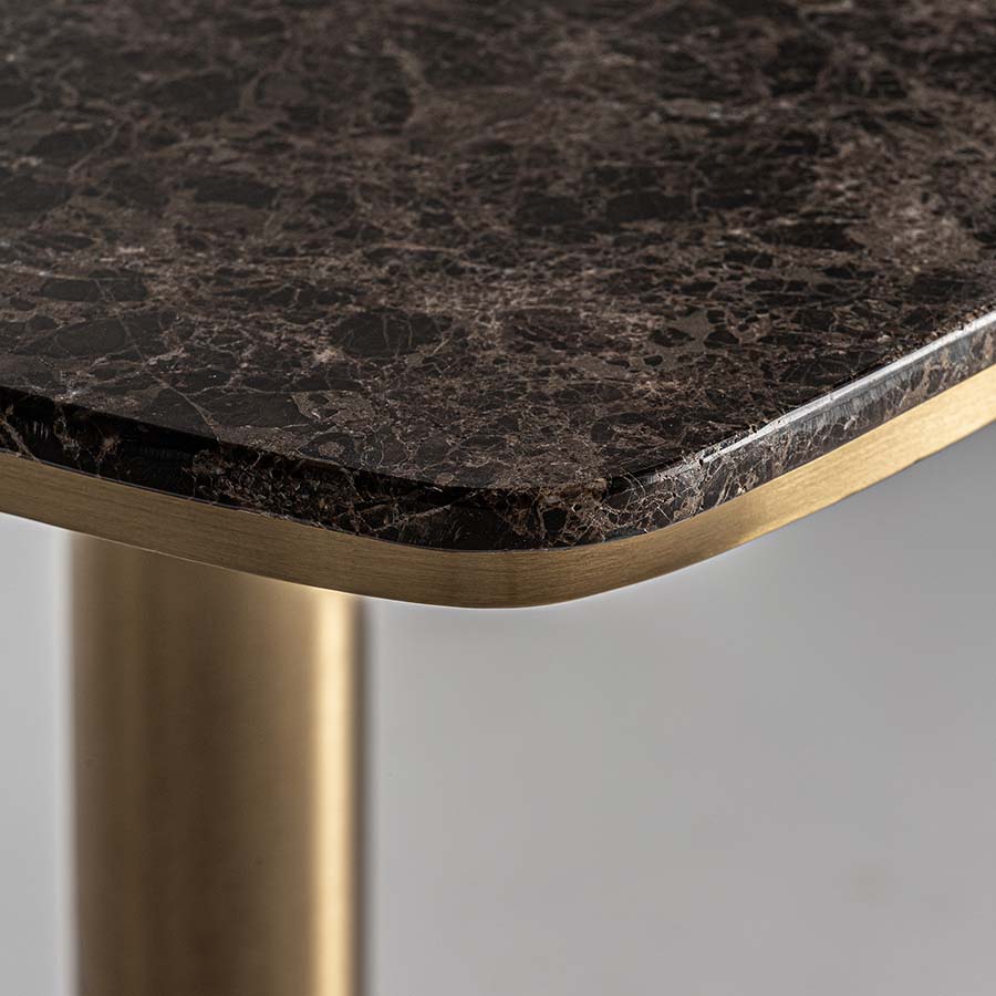 Mesa bar valreas de estilo art deco. Fabricado en mármol en color marrón combinado con acero inoxidable en color oro.