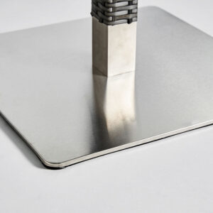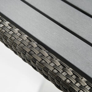 Mesa bar walnut, en color plata, de estilo contemporáneo. Fabricado en aluminio, combinado con ratán y plástico. Producto desmontable.