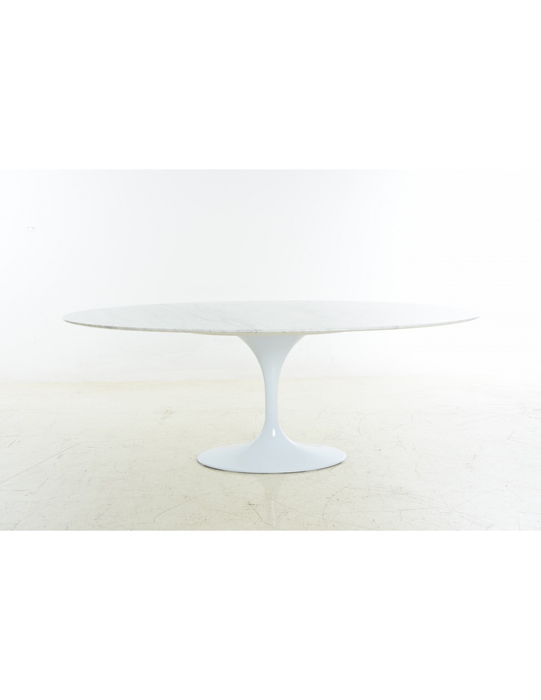 Mesa de marmol ovalada y pata de metal en color blanco.